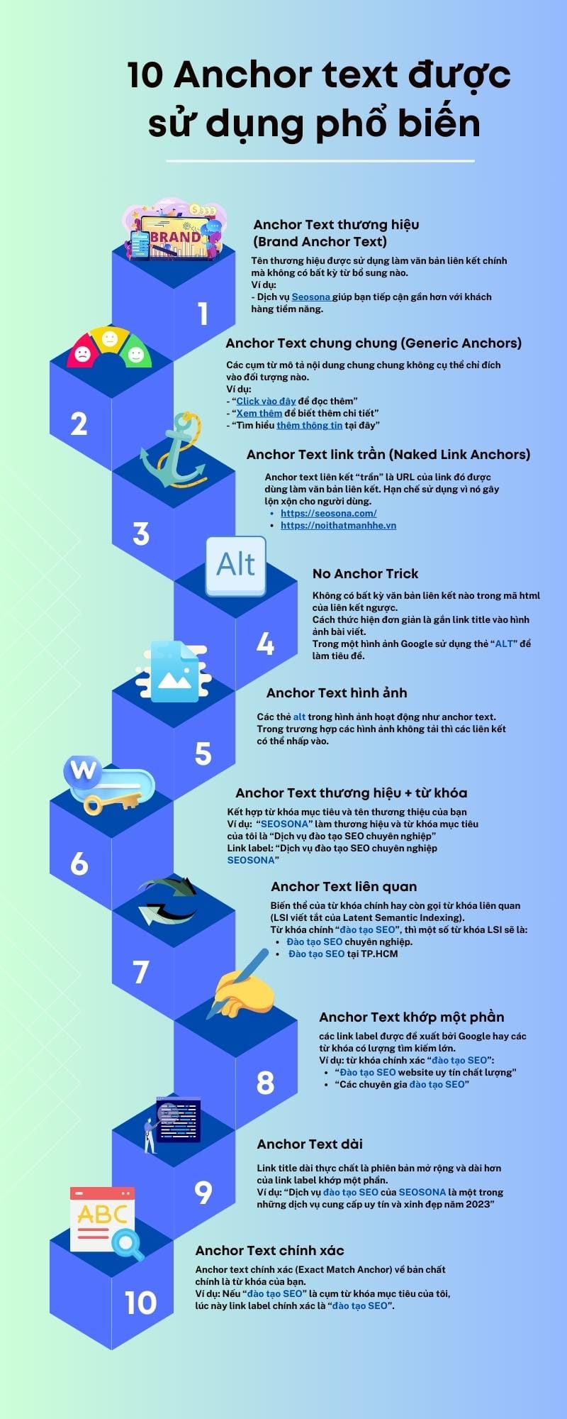 Việc sử dụng đa dạng Anchor Text giúp tránh việc bị Google đánh giá là spam hoặc tối ưu hóa quá mức. Dưới đây là các loại phổ biến nhất: