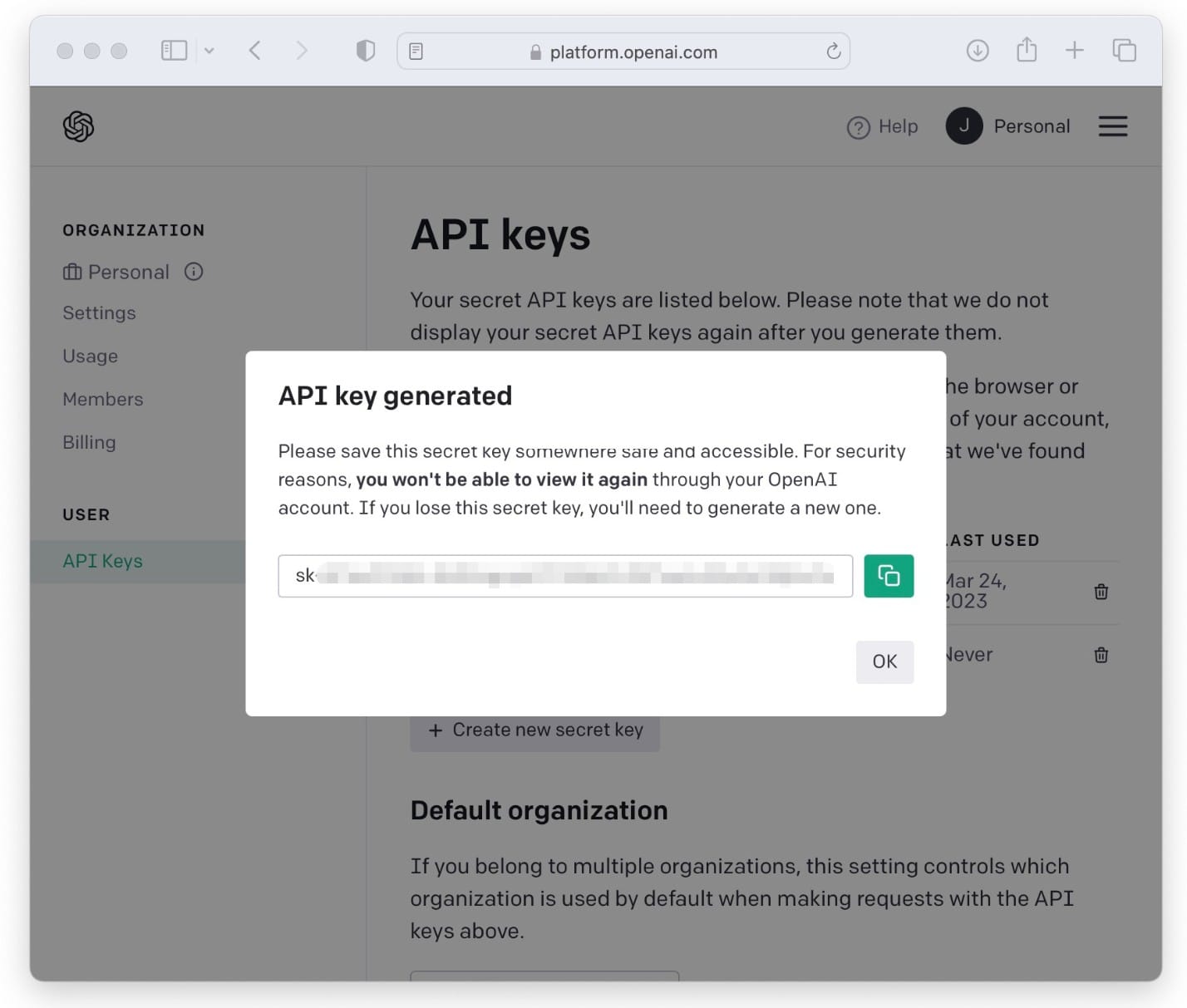 Truy cập vào https://platform.openai.com/account/api-keys, nhấn Create new secret key