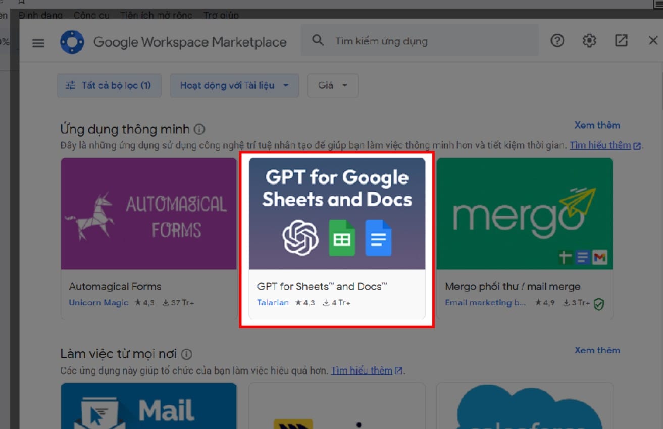 - Nhập vào từ khóa GPT for Sheet and Docs và nhấn tìm kiếm