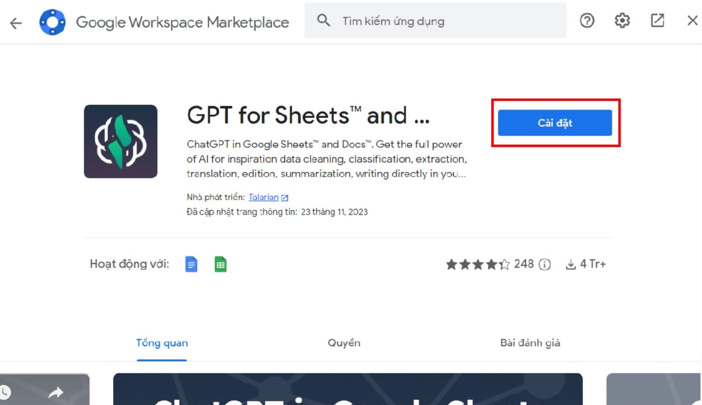 - Tiện ích mở rộng GPT for Sheet and Docs sẽ xuất hiện, và chúng ta tiến hành cài đặt như hướng dẫn nhé