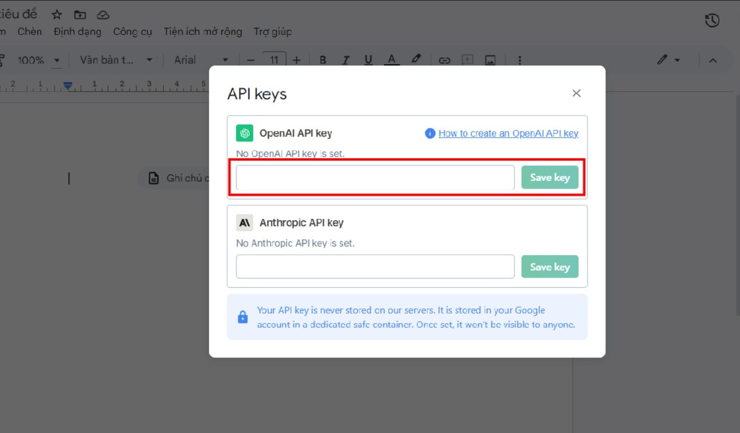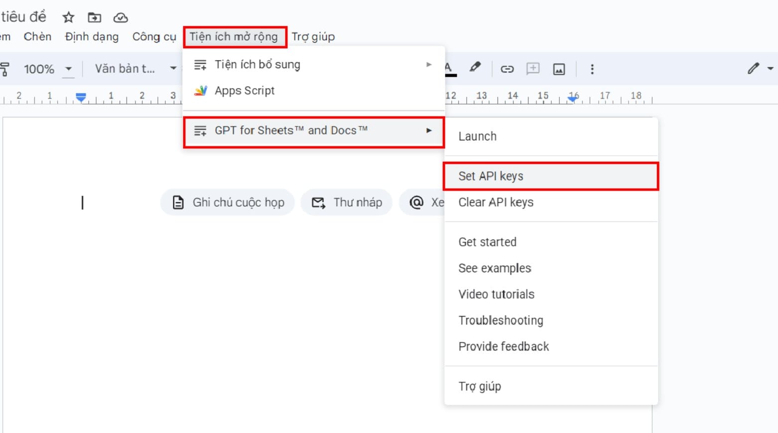 Vào Extensions > chọn GPT for Sheet and Docs > Set API keys
